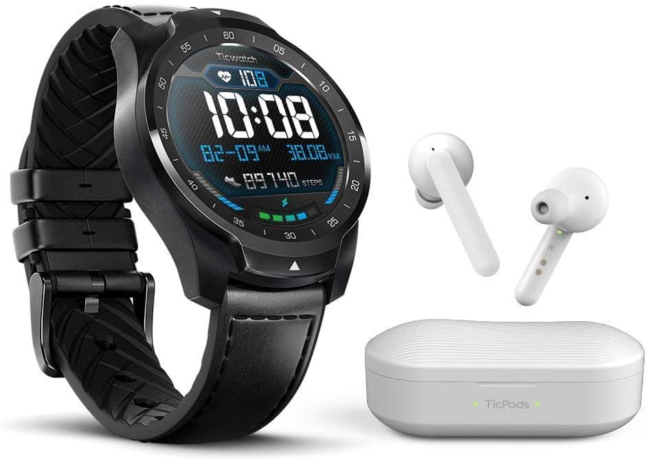 TicWatch Bundle with TicWatch Pro 2020 Smartwatch Dual Display Long Battery Life Wear OS, GPS NFC IP68 Waterproof - Black + TicPods 1 True Wireless Earbuds - Ice
