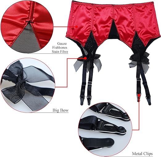 TVRtyle Women's Red Satin Sexy Wide Straps Big Bow Metal Clips Garter Belts for Stockings S511R